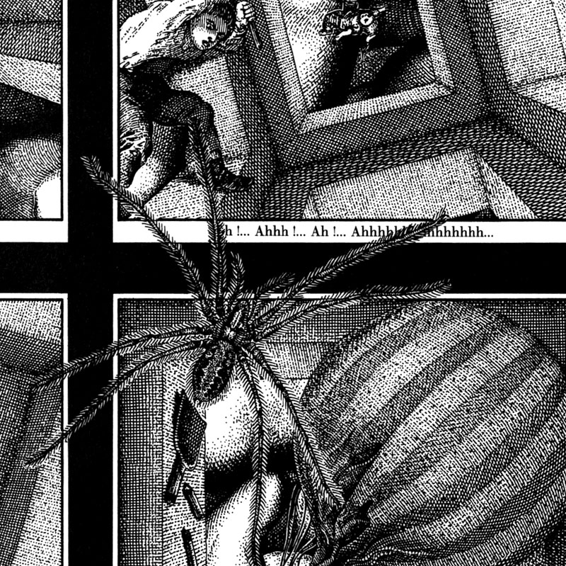 Tout ceci arrache le champ dessiné à son cadre illusionniste — ce monde crédible et simulé qui est la condition première de toute réalisation narrative — pour le maintenir obstinément dans le nôtre. Ce qu’il y fait, c’est la marque d’une perforation inachevée. Il le creuse inlassablement, inefficacement, absurdement, faisant état de sa matérialité obtuse, de son infranchissabilité : une frontalité chasse l’autre et aboutit à un monde de cloisons qui pourraient bien coulisser à l’infini sans aucune réelle profondeur…
