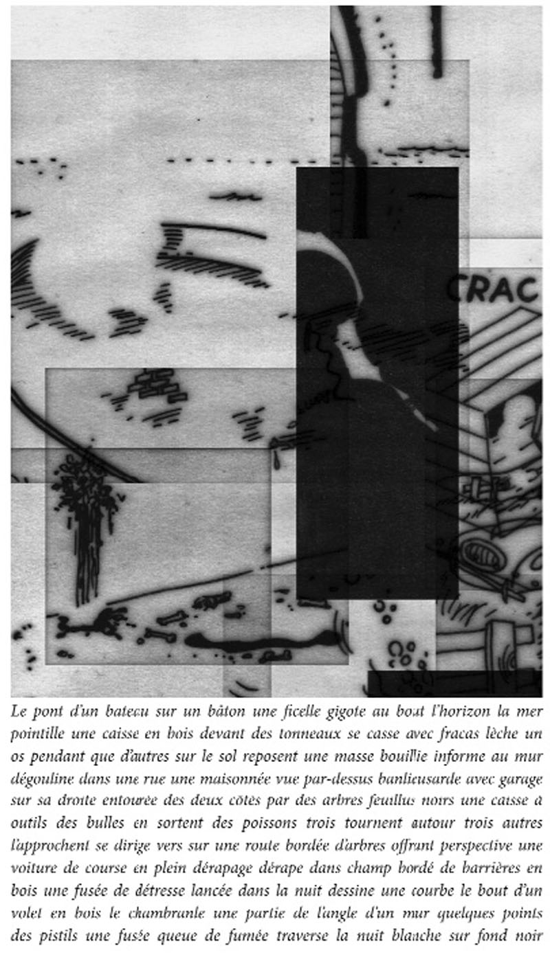 Alors qu’est-ce que le livre ici ? C’est pourtant l’infrangible, c’est encore du cadastre réduit à s’exhiber dans tout son arbitraire. Le texte haché, les mots coupés et strips tronqués montrent littéralement le geste décisoire discrétisant toute unité graphique ou textuelle, mais ce geste reste ici absent ou plutôt congédié : couper cartes et textes n’est pas un nouvel acte de cadastrage parce que la coupe est quelconque, que ses unités mêmes le sont tout en restant particularisées, parce que le cadastre est conjuré au profit d’un non-choix supérieur, d’une noluntas, une nolonté qui tranche mais qui ne choisit pas. Cette construction par désassemblage est une sorte de collagisme en braille, de cut-up mécanique ou de zen qui couperait, cut-toil, toil-up. Le texte n’a en droit pas plus de début de fin ou de structure phrastique que la carte n’a de bord, tout file et s’invagine en deux indéfinis. Les planches de Largier (notamment dans la revue 1.25) peuvent être vues comme des livres d’une page, ou des livres potentiels avalés dans l’unicité d’une carte qui ne serait elle-même qu’une vaste page et fragment d’un plus grand ensemble, carte et page à la fois.