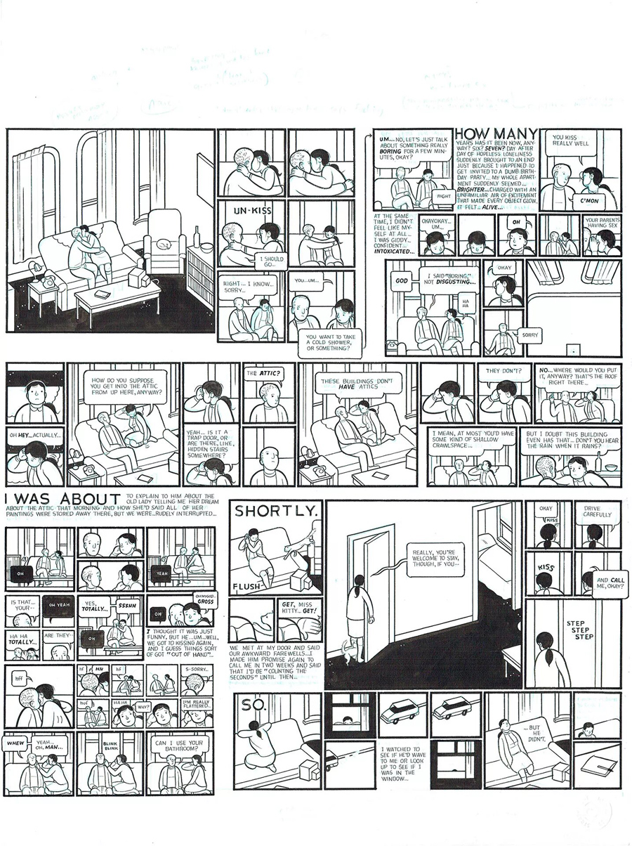 J.-F. : Dans Building Stories, il y a plus qu’une remise en cause de la figure linéaire de la narration : j’y vois la recherche d’une polyphonie énonciative, d’une « graphiation » constellatoire. C’est la polyphonie des habitations collectives, l’enregistrement immobilier de la vie distribuée en tranches historiques : construction et reconstruction, d’où ces histoires de vies et les tremblements du langage dans les murs de l’immeuble ; les anciennes voix qui l’incarnent dans le temps. Cela rappelle l’aventure de New-York dans la polyphonie des destins mis en scène dans Manhattan transfer (Dos Passos). Car, il y a bien cette volonté de passer par l’architectural : « musique gelée ». Et de faire de l’agencement des espaces, la perspective d’un vivre et d’une expérience artistique. La narration est une construction jamais entièrement réalisée. Les changements d’échelle, les temporalités croisées, les jeux de focalisation télescopiques sont autant de mobilisations du corps et de la voix. Tu parlais à travers ça des enjeux de manipulation, de la reconstruction, de l’unicité de chaque lecture dans un ordre chaque fois différent. La question de la corporalisation, du corps accidenté, de la recherche d’une reconstitution impossible de l’entier me semble circuler de l’histoire à ses modes de présentation, incarnée par la jambe amputée de la jeune femme. Le corps, s’il est corporalisation, ne prend sa réalité que dans le rapport à la signifiance qu’il constitue dans sa représentation et les moyens langagiers de cette représentation. J’y mets le dessin du corps comme aventure du morcellement symbolique en quatorze parties. Pourtant, bien qu’il manque une jambe au corps de cette jeune femme sans nom, son corps est entier. L’absence de nom propre est particulier à la rhétorique de l’individu — on n’appelle pas l’individu ; ce vide du sujet ou ce sujet à remplir par un autre est une forme sociale imaginaire comme Benasayag parle de mythe de l’individu. Pas de nom, juste une emprise sociale, une plasticité instrumentale : un stéréotype imaginaire habitable par n’importe quel lecteur. Comme Jimmy Corrigan, c’est un faux « livre sur rien », plein d’agencements minuscules et de représentations stéréotypées. Ce n’est pas la complétude du corps qui fait le corps. Pourtant, il y a cette jambe qui manque, le décalage entre un corps réel et un corps imaginaire ; une jambe du désir, un sceptre d’émotion. Groensteen parle de fragments ; il a tort, ce n’est pas la logique de la chose, chaque élément est un entier, un passage dans l’histoire. J’y vois une concentration de moyens. C’est la polyphonie du temps en soi, pris dans les strates d’émotion, de l’imaginaire. Une temporalité propre à l’agencement de l’œuvre partagée en lecture.