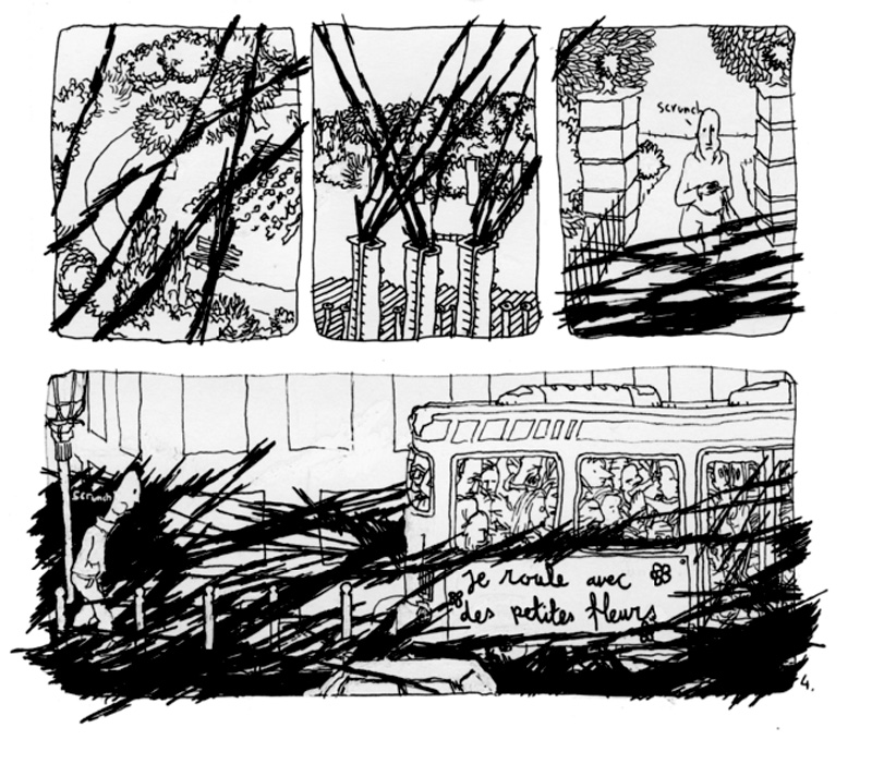 La mise en dessins de ces lieux prend des allures très différentes au fil des cadrages choisis : Bed and Breakfast aborde principalement la construction de la vie collective et de l’architecture intérieure du lieu, tandis que No futur is not dead interroge en outre la vie à l’extérieur du squat. Le second est dessiné non sans une certaine véhémence, revendiquée dans ses atours et références punk, face notamment à l’urbanisme des villes européennes imposé par une société capitaliste qui, elle, n’est toujours pas morte. L’ensemble de la bande dessinée est construit sur des lignes tremblées et de forts contrastes noir et blanc, survolé de nuages de ratures noires, nerveuses, et de blanco ou de gouache salissant un peu tout sur son passage. De fait la laideur de ce monde n’est pas ignorée : ici le discours d’un flic expliquant à un voisin au coin d’une case que « oui, bon, en même temps ils ne payaient pas de loyer » pour justifier l’infamie, ou, là-bas, cette insulte à l’intelligence que sont des publicités vantant un capitalisme vert. Ces percées discursives hégémoniques dans la rumeur de la ville, autant verbales que graphiques, n’endommagent pas la beauté de certaines constructions bricolées, que ce soit la façade biscornue du squat avec son système de gouttière pour les clefs ou un radeau à plusieurs étages comme échappatoire à ce monde, sa laideur, son absence de perspective.