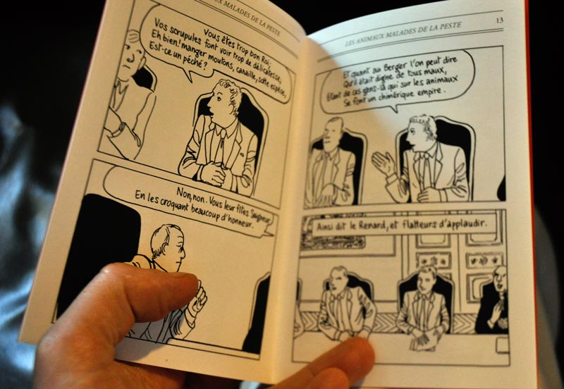 Ben, à ce moment-là, — (C.d.T.) Parce qu'en fait, je vois que ce que tu fais sur Jean de La Fontaine en ce moment, ça fait parti de L'avancée des travaux ? Tu considères que c'est dans la même… — (S.L.) Oui. — (C.d.T.) C'est dans le même projet ? Tout ce que tu fais maintenant, c'est dans L'avancée des travaux, en fait ? — (S.L.) Grosso modo, oui. C'est ça. L'Avancée des travaux est un titre générique pour y mettre une partie de mes projets en cours.Mais bon, j'ai fait un B.D. cul (ndlr : collection pornographique de poche des éditions Les Requins Marteaux) qui n'est pas du tout publié dans L'avancée des travaux, hein ! Et puis d'autres trucs à côté. Mais en fait, j'intègre des projets… Je sais pas comment ça se passe… Si tu veux. Là, je me suis dit que… Ben j'avais présenté ce truc là parce que… C'est toujours des occasions. Qui font que tu fais les choses. Là, par exemple.. Là c’est pour le festival Images de justice — (C.d.T.) C'est Les animaux malades de la peste dont parle Sébastien — (S.L.) Voilà. Je vais donc exposer ces pages-là, parce que c'est dans le cadre d'une expo collective autour de la justice. C'est Marianne Bressy qui m'invite à participer. Evidemment, je pourrais faire un dessin, quelque chose qui se prête mieux à une expo, mais je me dis que je vais plutôt faire une bd (car c'est ce que je sais faire ! Mon métier quoi !), et comme je n'ai absolument pas le temps, je me dis que je vais adapter le texte qui me vient à l'esprit tout de suite : les Animaux malades de la peste. Ce sera la première fois que j'adapte un texte. En plus, un texte très connu, ça me fait très bizarre et je me dis qu'il ne faut pas que je tombe dans le piège de l'illustration, le scolaire... Mais pour moi, l'expo… Exposer des planches c'est… C'est un peu con. Donc je me dis que je vais en faire un livret, pour que ça puisse être lu. Je vais en faire un Avancée des travaux. Sauf qu’en fait, il sort un peu trop tard, il y a Angoulême à ce moment-là, et du coup, il ne sera pas présenté avec l'expo. Tant pis, ce n'est pas grave. Et en fait c'est surtout que, ben là, en faisant ça j'ai un projet qui en découle. C'est-à-dire que je ne pensais pas avoir l'envie d'en faire un livre. Or là, j'en ai l'envie. Et j'en fais un deuxième… Parce qu'en fait, j'ai envie de savoir un petit peu — quand il sortira, ben vous aurez un exemplaire — et puis ça me fait plaisir d'avoir des retours. C'est-à-dire que pour moi c'est… J'ai pas d'atelier. Je travaille chez moi où je travaille à la B U, à Rennes II. Parce que c'est un cadre idéal pour moi. Et du coup, en fait, c'est comme si c'était mon atelier, le livret, c'est ça mon atelier. Et du coup, le faite d'en filer aux uns et aux autres, et le fait d'avoir des retours, c'est comme si on pouvait commenter mon travail et me dire : « ah ben ça, c'est un peu loupé… » ou « c'est super » — (C.d.T.) : c'est-à-dire que le livre lui-même est ton atelier ? — (S.L.) C'est ça. Je présente le truc qui est en cours.